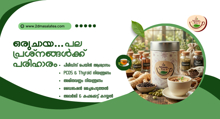 2D മസാല ടീ – ആർത്തവവേദന, പി.സി.ഓ.എസ്, തൈറോയ്ഡ്, അമിതവണ്ണം എന്നിവയ്ക്ക് സ്വാഭാവിക പരിഹാരം | കേരളത്തിൽ ലഭ്യം