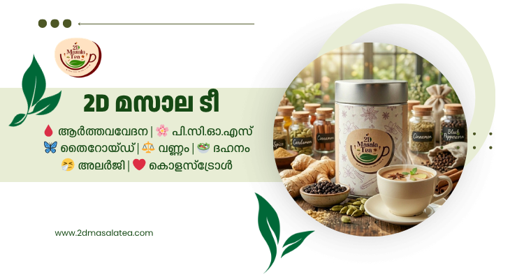 ആർത്തവവേദന, പി.സി.ഓ.എസ്, തൈറോയ്ഡ്, ദഹനക്കേട് മൂലമുള്ള അമിതവണ്ണം, കൊളസ്ട്രോൾ, വിട്ടുമാറാത്ത അലർജി എന്നിവയ്ക്ക് 2D മസാല ടീ. മരുന്നല്ല. ഏതു പ്രായക്കാർക്കും ഉപയോഗിക്കാം. ശരിയായ രീതിയും അളവും അറിയാൻ വായിക്കുക.