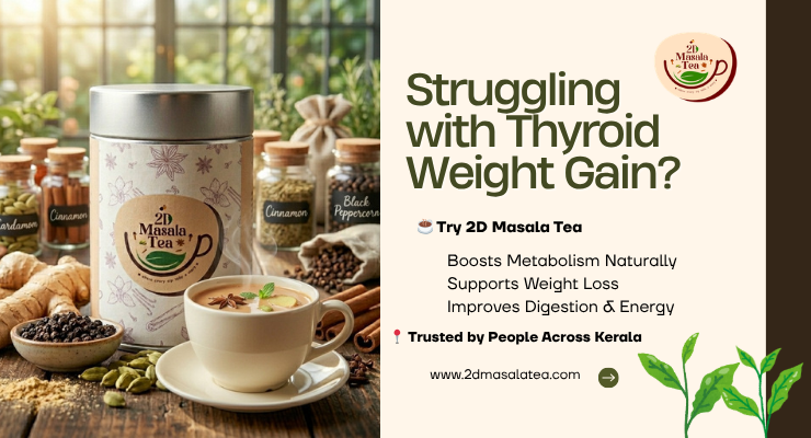 Struggling with thyroid-related weight gain in Kerala? 2D Masala Tea boosts metabolism, aids digestion, and helps manage weight naturally. Not a medicine. Safe for all ages. See results in 3 months.