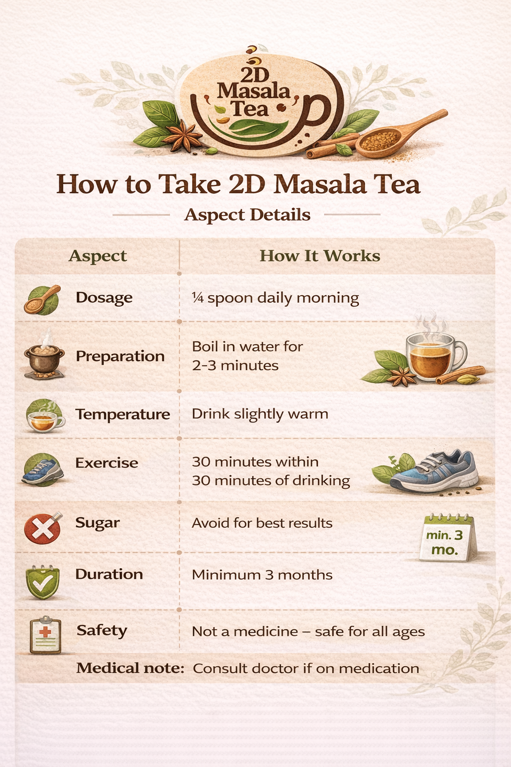 Important: 2D Masala Tea is not a medicine. It is a traditional wellness drink inspired by Kerala's kitchen wisdom. It is safe for all ages and can be used alongside a healthy lifestyle.