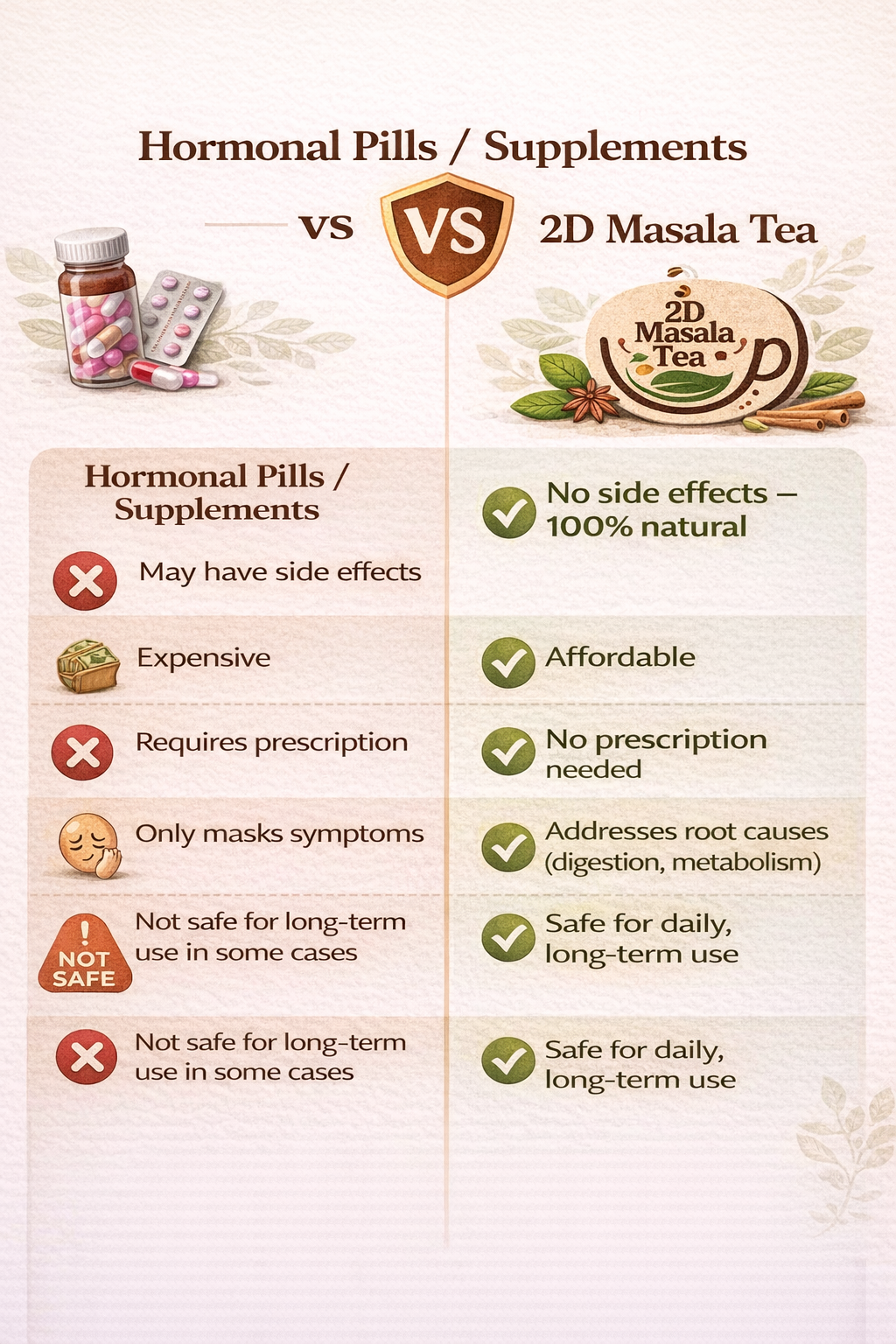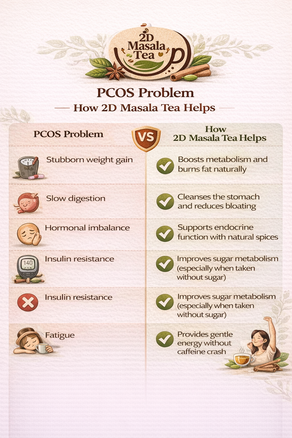 PCOS is often linked to three root problems: insulin resistance, slow metabolism, and poor digestion. 2D Masala Tea addresses all three naturally.