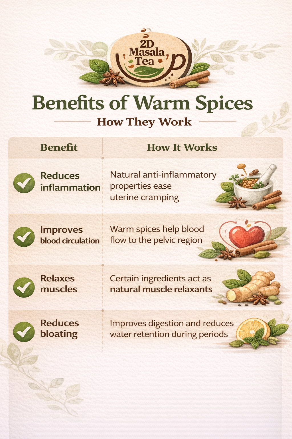 Period pain (dysmenorrhea) is caused by uterine contractions triggered by hormone-like substances called prostaglandins. The natural spices in 2D Masala Tea work in several ways: