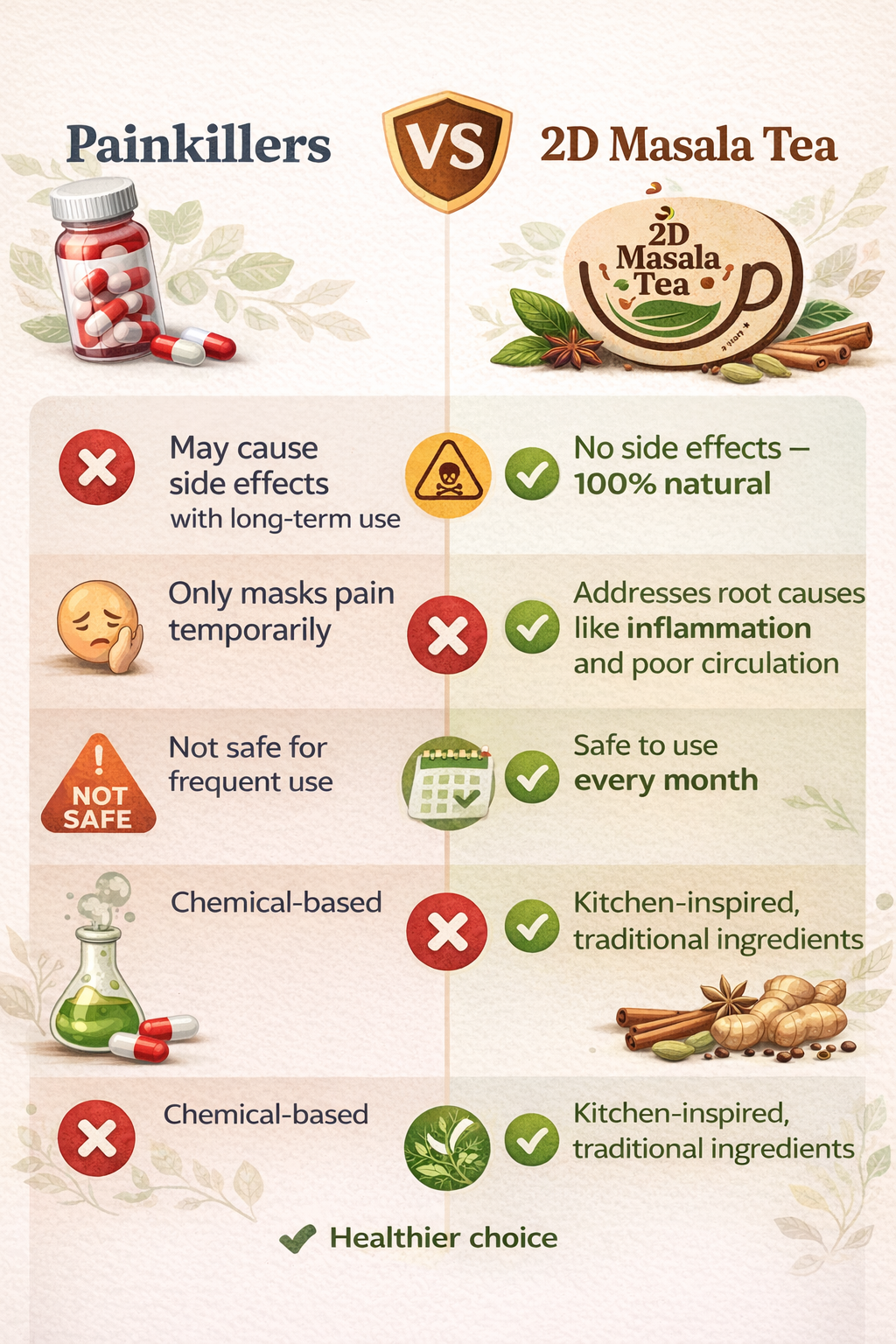 2D Masala Tea is a carefully blended herbal tea made from traditional spices. It is not a medicine – it is a natural wellness drink rooted in Kerala's kitchen wisdom. Unlike regular chai, this tea is designed to address specific health concerns, with period pain relief being its most powerful benefit.